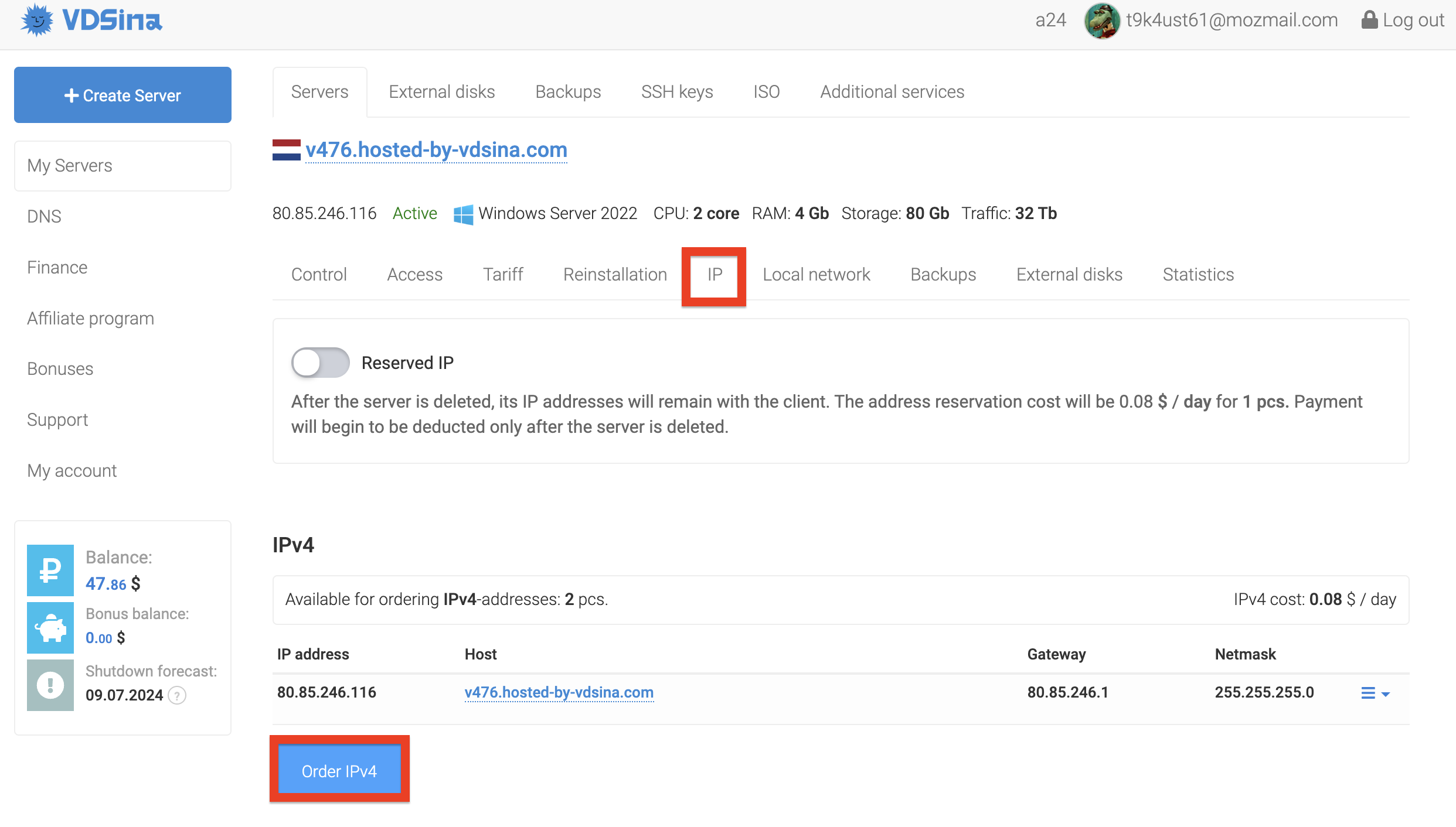 To order an additional IPv4 address, go to the control panel, select the "My servers" section, select the desired service and click on the hostname, click on the "IP" tab